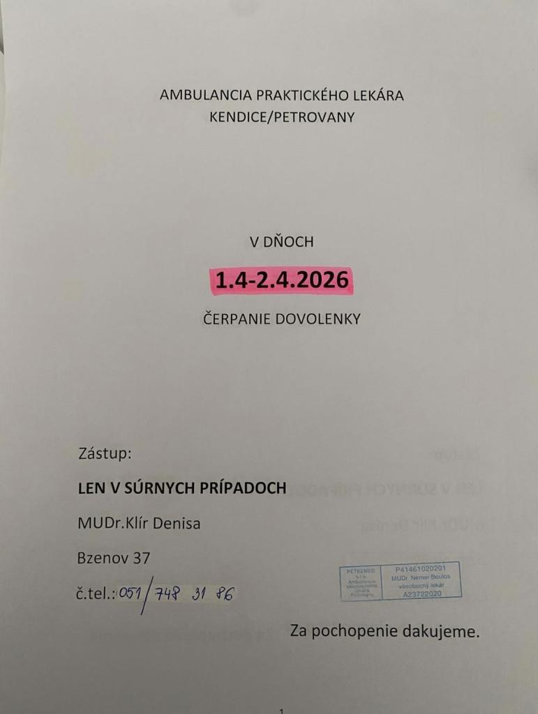 Ambulancia praktického lekára Kendice/Petrovany - OZNAM