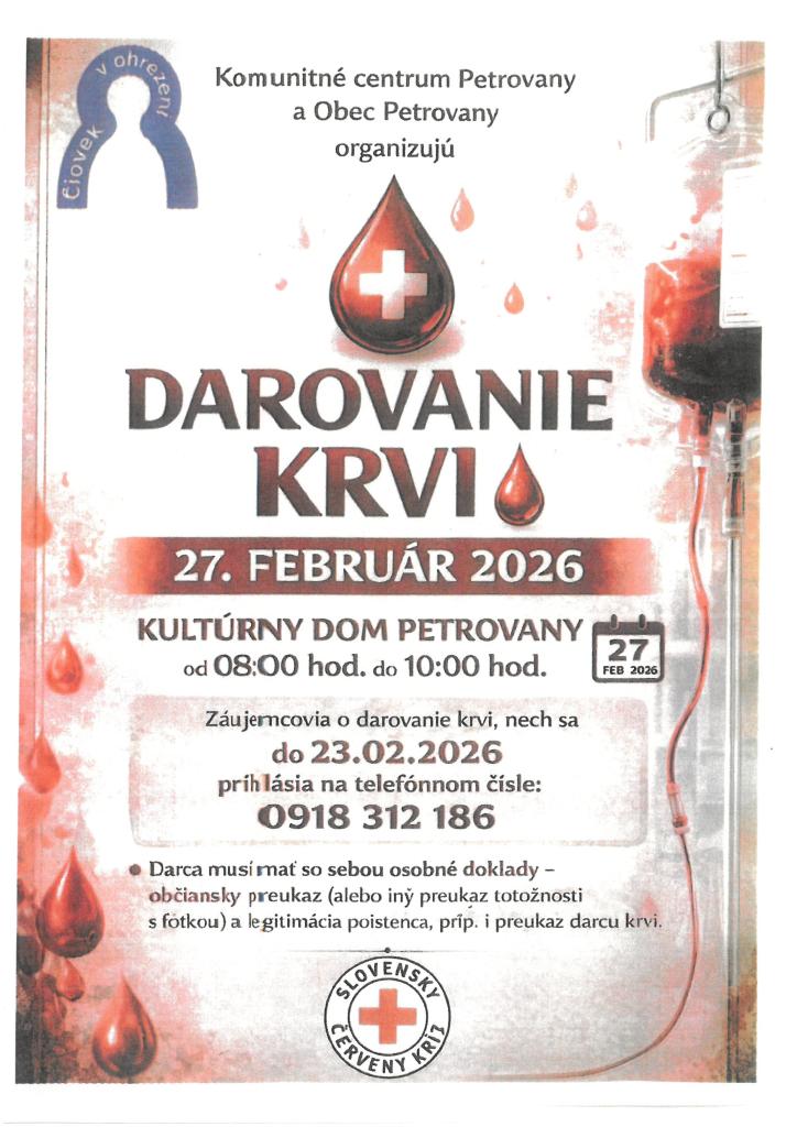 Komunitné centrum a Obec Petrovany organizujú darovanie krvi dňa 23. februára 2026. Záujemcovia sa môžu prihlásiť na telefónnom čísle 0918 312 186.