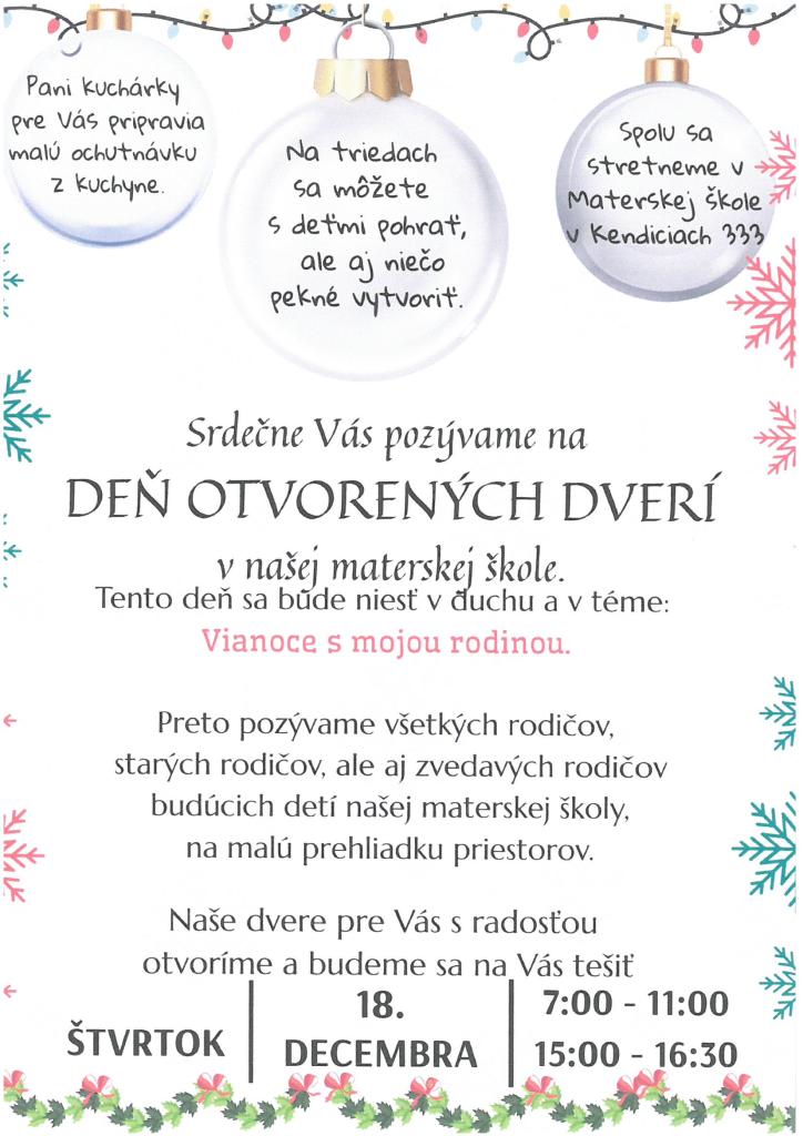 Srdečne Vás pozývame na deň otvorených dverí v našej materskej škole, ktorý sa uskutoční 18. decembra. Téma akcie bude Vianoce s mojou rodinou a tešíme sa na všetkých rodičov, starých rodičov a budúcich rodičov.