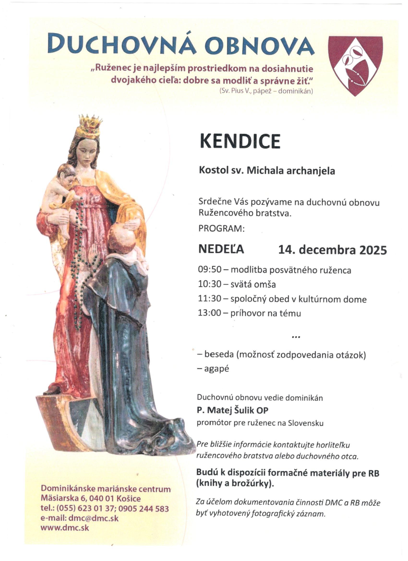 Srdečne Vás pozývame na duchovnú obnovu Ružencového bratstva dňa 14. decembra 2025 v kostole sv. Michala Archanjela v Kendiciach.