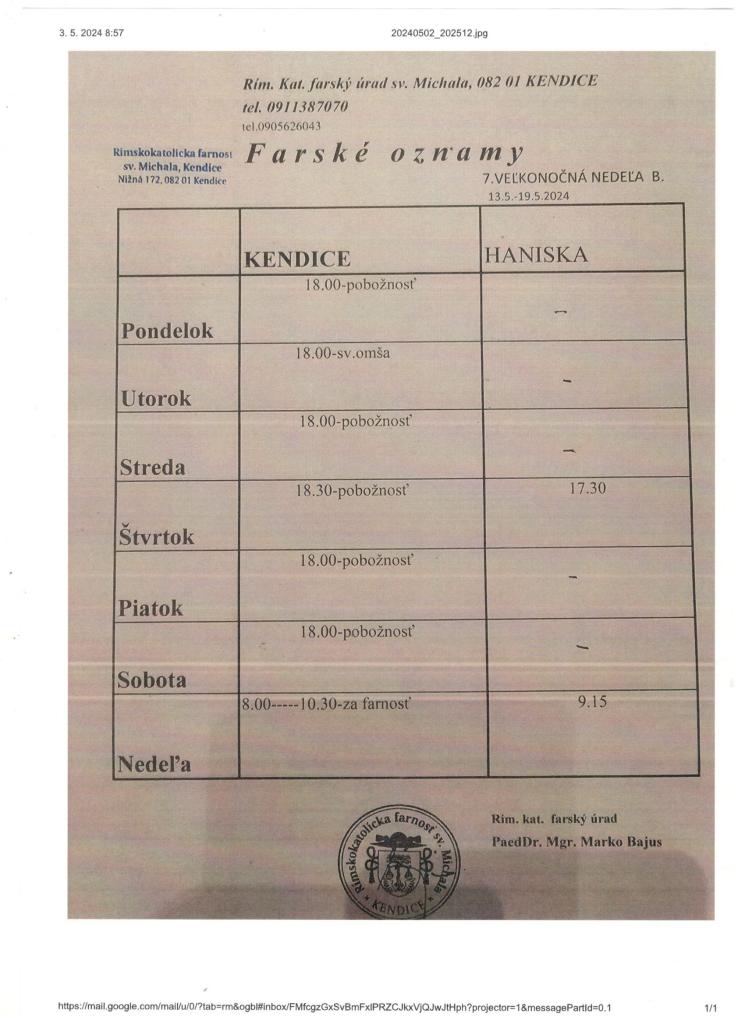 Farské oznamy od 13.5.-19.5.2024 7.veľkonočná nedeľa B