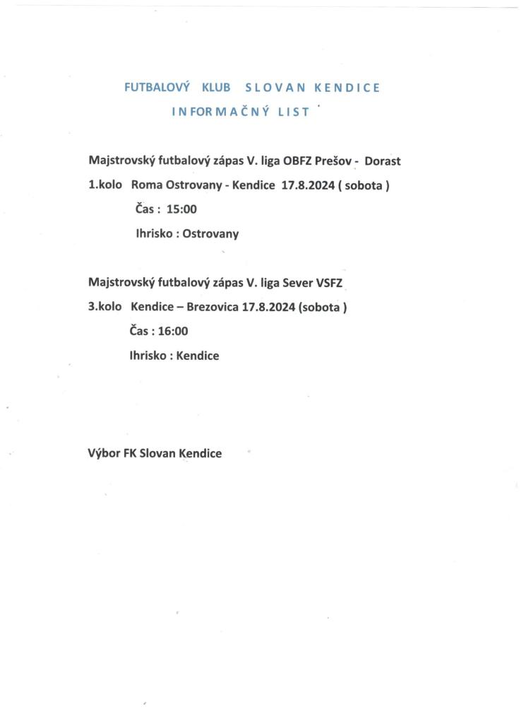 Informačný list- futbalové zápasy, ktoré sa odohrajú 17.8.2024