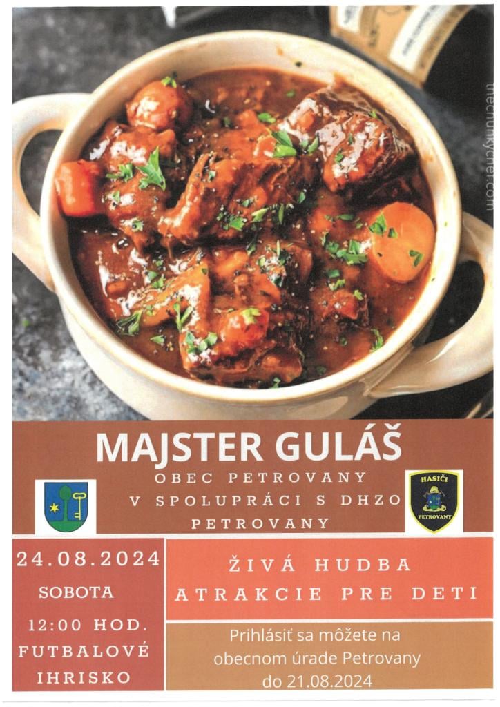 Obec Petrovany Vás pozýva dňa 24.8.2024 ( sobota) o 12,00 hod. na "Majster guľáš " , ktorý sa uskutoční na miestnom futbalovom ihrisku.