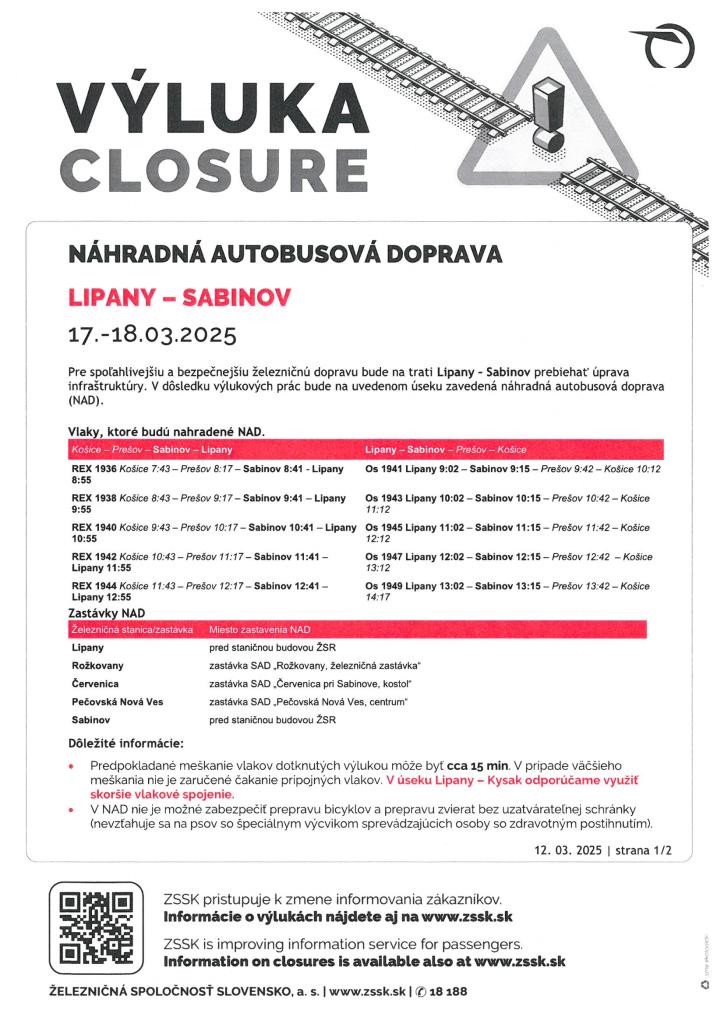 Pre údržbu železničnej infraštruktúry na trati Lipany - Sabinov bude od 17. do 18. marca 2025 zavedená náhradná autobusová doprava. Cestujúci by mali byť pripravení na potenciálne meškania a obmedzenia pri preprave bicyklov a zvierat. Zastávky NAD sú uvedené v správe.