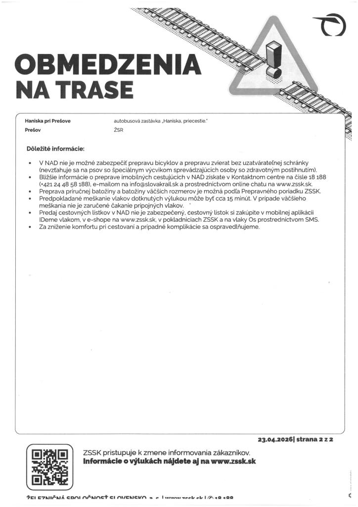 Obmedzenia na trase Kysak - Drienovská Nová Ves - Prešov 28.4.2026