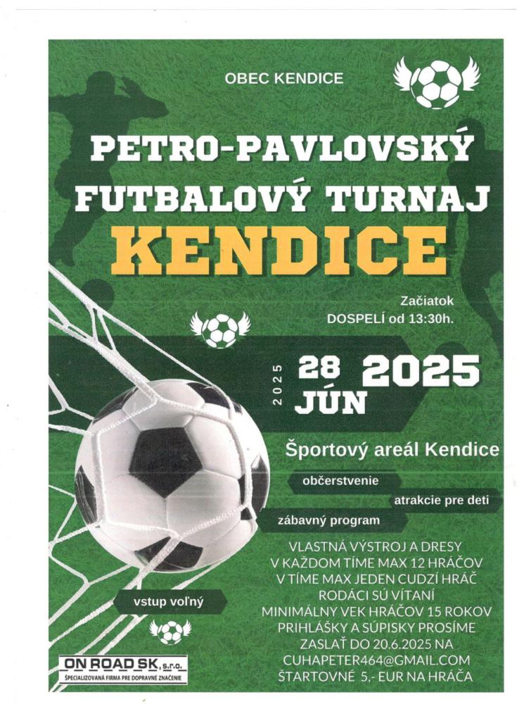 Obec Kendice pozýva všetkých nadšencov futbalu na športový turnaj, ktorý sa uskutoční 28. júna 2025 so začiatkom o 13:30 hod. v športovom areáli Kendice. Tímový formát umožňuje maximálne 12 hráčov a jedného cudzinca, pričom rodáci sú vítaní. Prihlášky je potrebné zaslať do 20. júna a štartovné činí 5 EUR na hráča. Pripravené budú aj atrakcie pre deti a občerstvenie pre všetkých účastníkov.