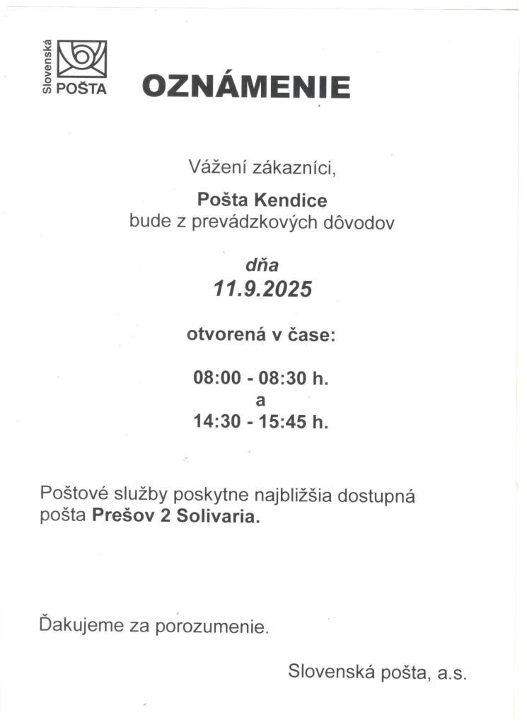 Pošta Kendice bude z prevádzkových dôvodov dňa 11.9.2025 otvorená v čase od 8:00 hod. do 8:30 hod a od 14:30 hod do 15:45 hod.