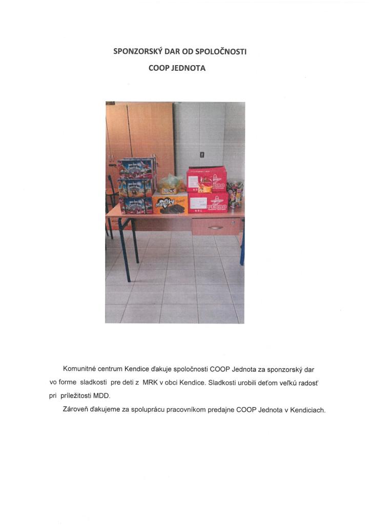 Komunitné centrum Kendice ďakuje spoločnosti COOP Jednota za sponzorský dar vo forme sladkosti pre deti z MRK v obci Kendice. Zároveň ďakujeme za spoluprácu pracovníkom predajne COOP Jednota v Kendiciach.