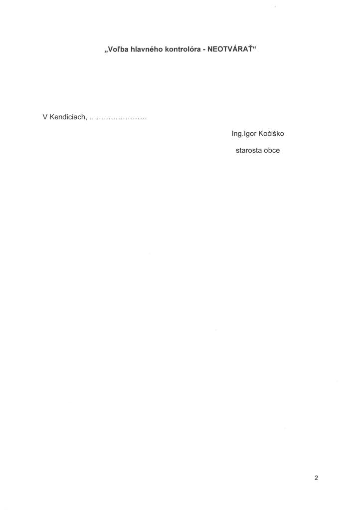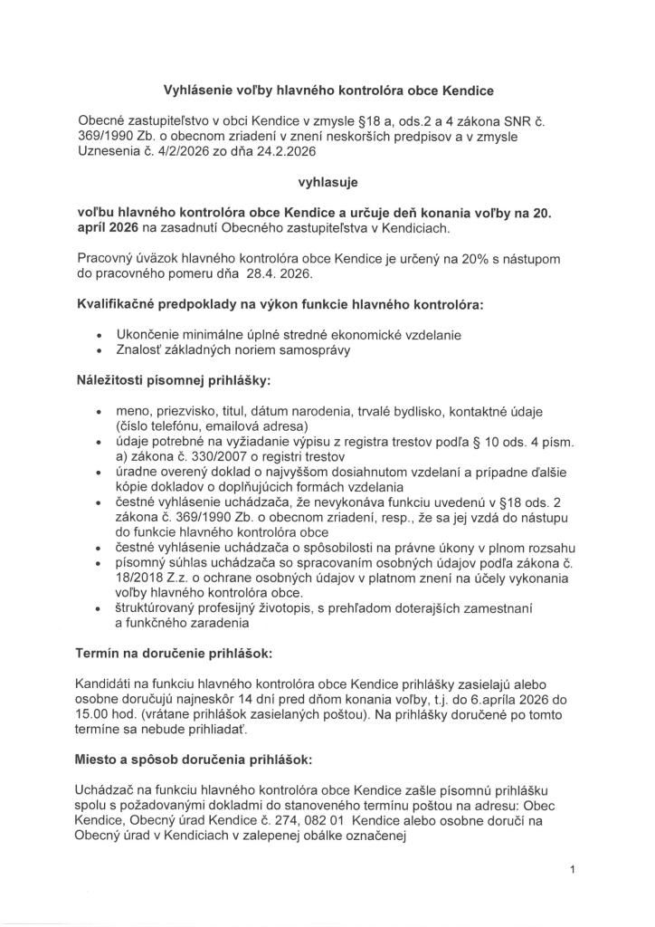 Vyhlásenie voľby hlavného kontrolóra obce Kendice Kandidáti na funkciu hlavného kontrolóra obce Kendice zasielajú prihlášky do 6.aprila 2026 do 15,00 hod.( osobne alebo poštou) Voľby na pozíciu hlavného kontrolóra sa uskutočnia 20.4.2026