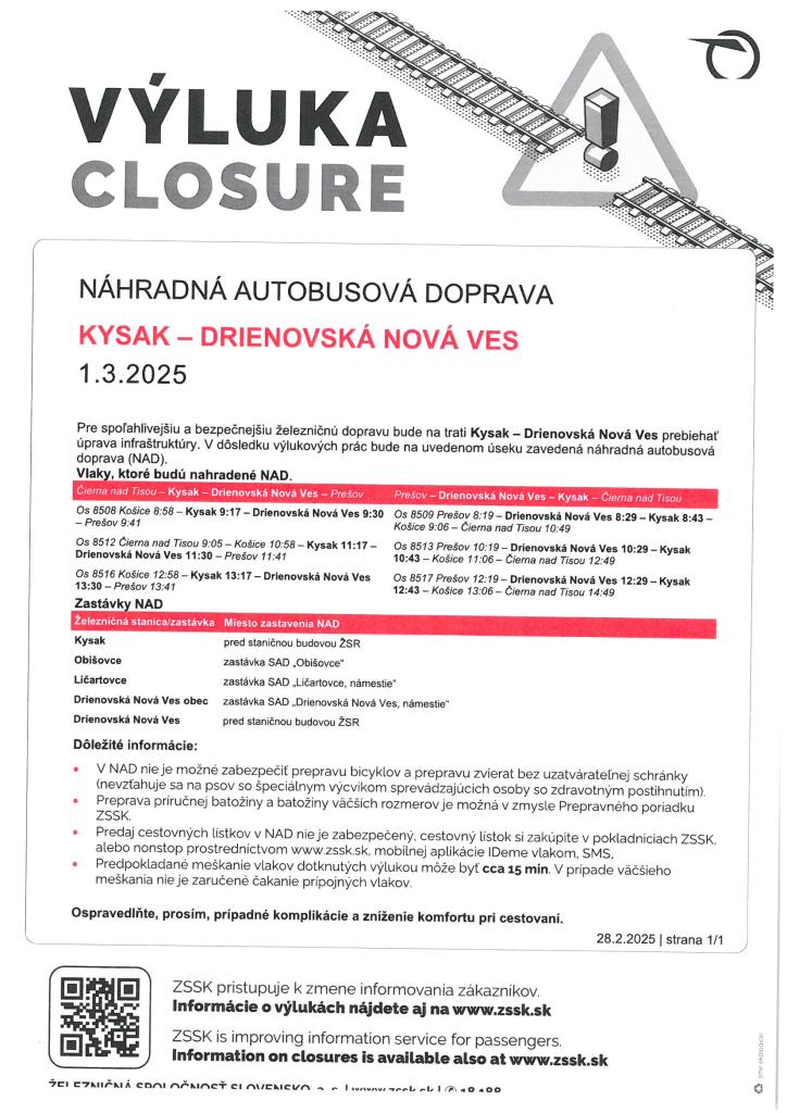 Výluka Kysak - Drienovská Nová Ves 1.3.2025