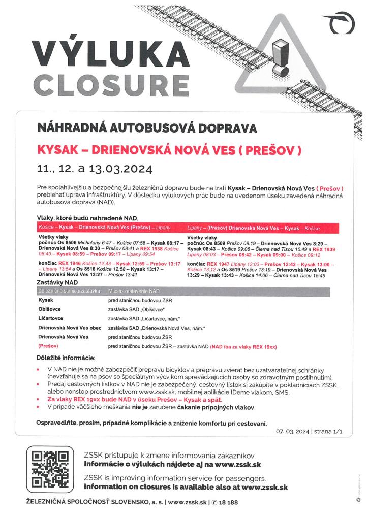 Výluka Kysak - Drienovská Nová Ves 11.,12. a 13.3.2024