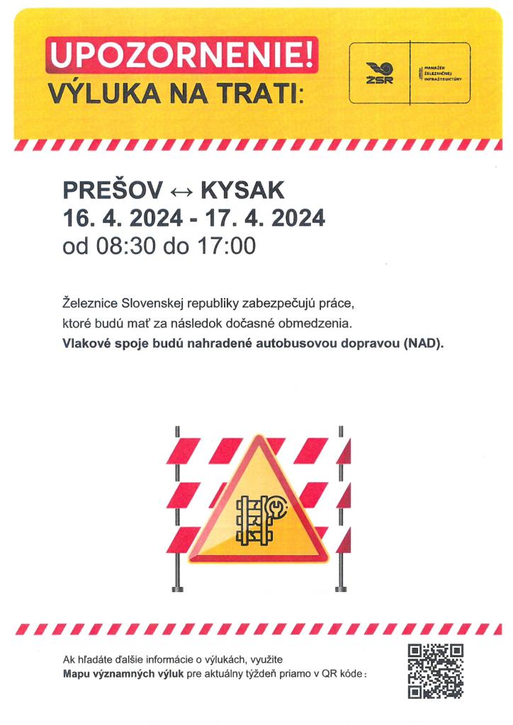 Výluka na trati Prešov - Kysak 16.4.2024-17.4.2024 od 8:00 do 17:00 hod.