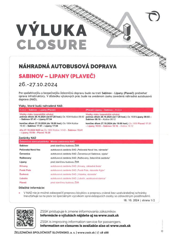 Výluka Sabinov - Lipany (Plaveč) 26.10.-27.10.2024
