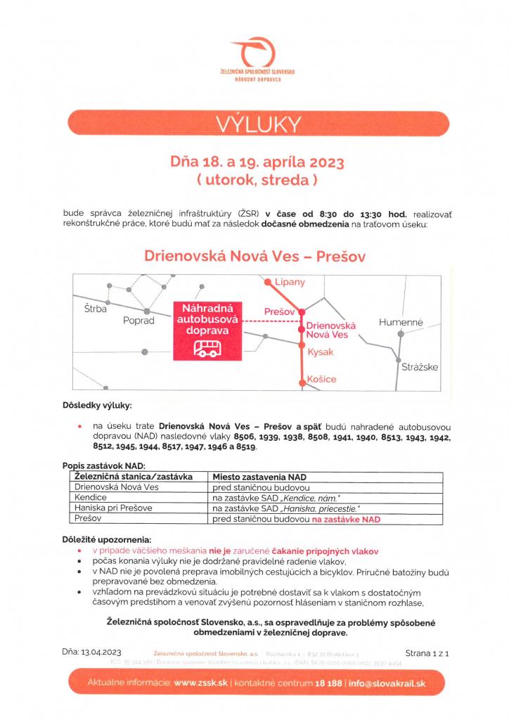 Dňa 18.4.2023 a 19.4.2023 bude správca železničnej infraštruktúry v čase od 8.30 do 13.30 hod. realizovať rekonštrukčné práce na úseku trate Drienovská Nová Ves- Prešov a späť, budú nahradené autobusovou dopravou