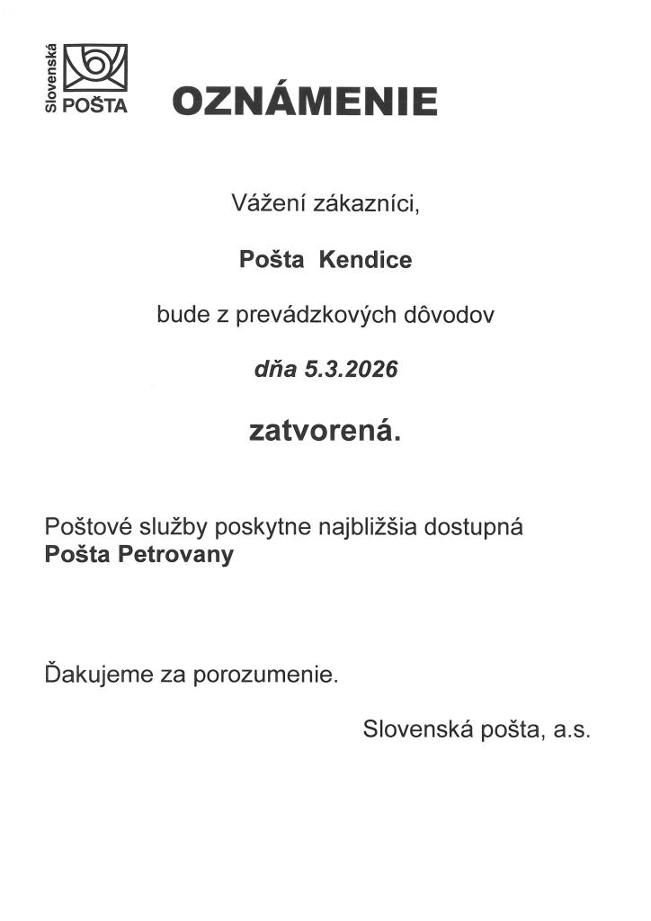 Pošta Kendice bude z prevádzkových dôvodov zatvorená dňa 5. marca 2026. Poštové služby budú zabezpečené na najbližšej pošte v Petrovanoch.