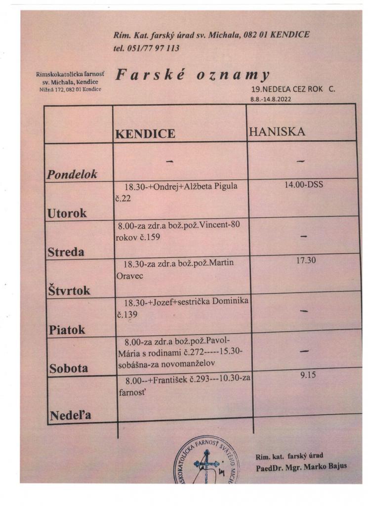 Farské oznamy od 8.8.2022-14.8.2022 19.nedeľa cez rok C